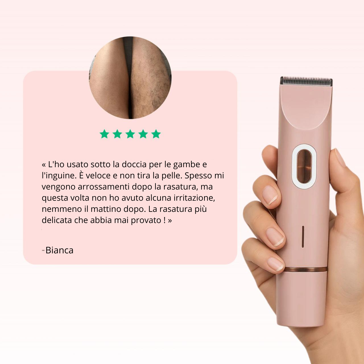 Sì, Kelya è stato progettato appositamente per essere delicato sulla pelle, anche nelle zone più sensibili come la zona bikini o le ascelle. Grazie alla doppia testina regolabarba/rasoio, garantisce una rasatura senza irritazioni né arrossamenti.